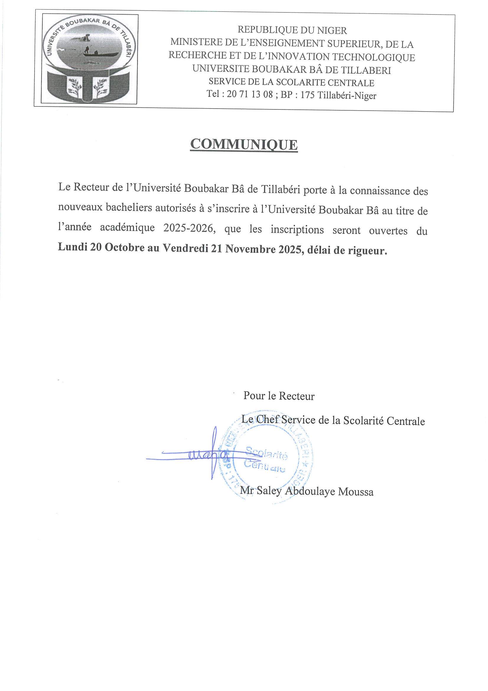 Le Recteur de l’Université Boubakar Bâ de Tillabéri porte à la connaissance des nouveaux bacheliers autorisés à s’inscrire à l’Université Boubakar Bâ au titre de l’année académique 2025-2026, que les inscriptions seront ouvertes du lundi 20 octobre au vendredi 21 novembre 2025, délai de rigueur.