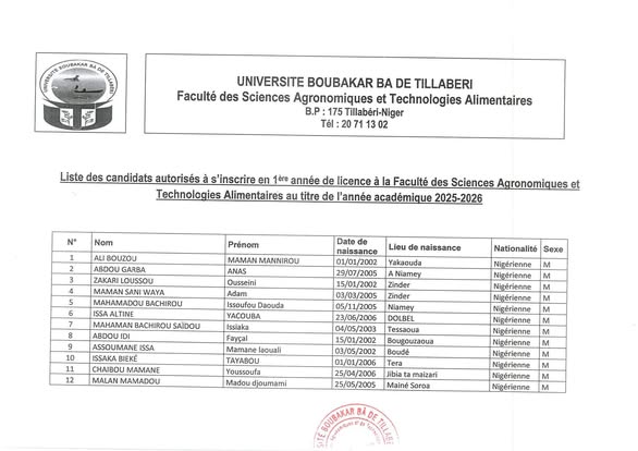 Liste des candidats autorisés à s’inscrire en première année de licence à la Faculté des Sciences Agronomiques et Technologies Alimentaires au titre de l’année académique 2025-2026.