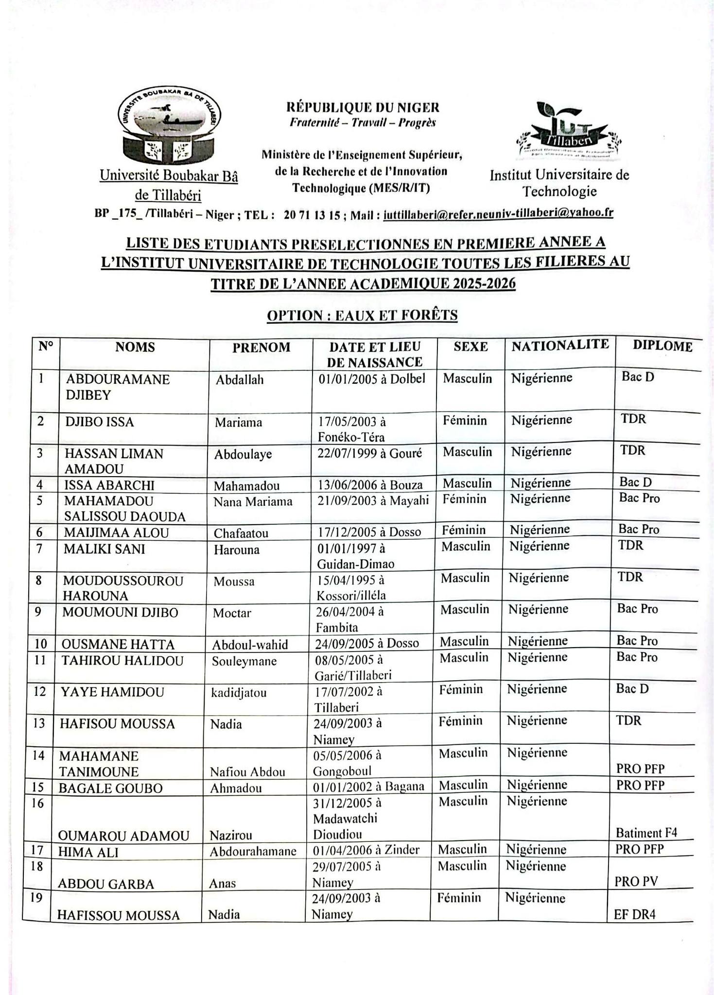 Liste des étudiants présélectionnés en première année à l’IUT au titre de l’année académique 2025-2026.