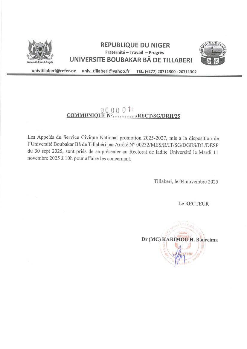 Les appelés du Service Civique National promotion 2025-2027, mis à la disposition de l’Université Boubakar Bâ de Tillabéri par arrêté N° 00232/MES/R/IT/SG/DGES/DL/DESP du 30 septembre 2025, sont priés de se présenter au Rectorat de ladite université le mardi 11 novembre 2025 à 10h pour affaire (...)